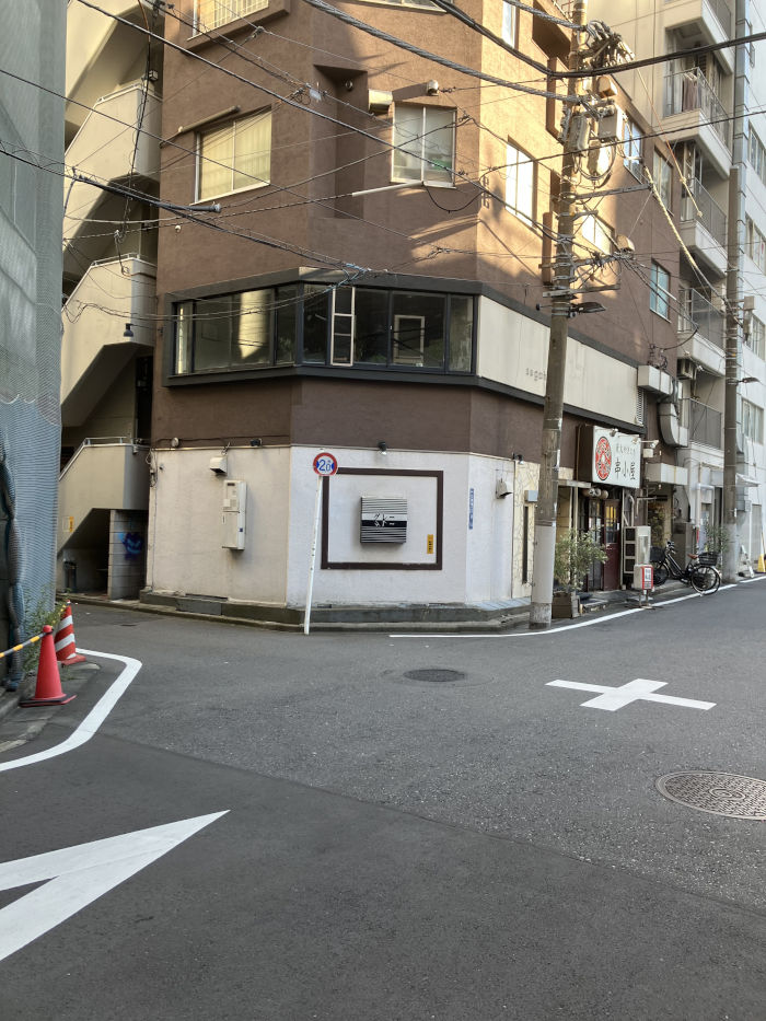 ⑤曲がって最初の角に当店の白黒の看板が見えます。